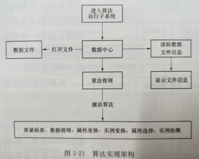 (2)預(yù)處理算法實(shí)現(xiàn)子系統(tǒng)。由于系統(tǒng)是文件驅(qū)動(dòng)的,算法的執(zhí)行必須有數(shù)據(jù)文件在沒(méi)有選擇輸入數(shù)據(jù)文件以前算法實(shí)現(xiàn)環(huán)境部分處于鎖定狀態(tài),在輸入數(shù)據(jù)文件后系統(tǒng)的算法實(shí)現(xiàn)環(huán)境部分的窗口就被激活根據(jù)前面的分析,算法實(shí)現(xiàn)環(huán)境部分包含六個(gè)方面,分別是質(zhì)量檢查、數(shù)據(jù)清理、屬性變換、實(shí)例變換、屬性選擇和實(shí)例檢測(cè)。此外,算法實(shí)現(xiàn)環(huán)境部分還包括對(duì)數(shù)據(jù)文件的操作和瀏覽等部分,如圖5-21所示。