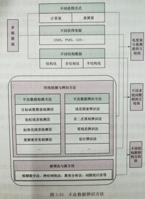 (4)數(shù)據(jù)質(zhì)量控制。數(shù)據(jù)的質(zhì)量關(guān)系到大數(shù)據(jù)的融合及相關(guān)關(guān)系分析的準(zhǔn)確性,其關(guān)鍵環(huán)節(jié)是不良數(shù)據(jù)檢測(cè),即判斷量測(cè)采樣中是否存在不良數(shù)據(jù)。不良數(shù)據(jù)辨識(shí)是指在發(fā)現(xiàn)某次量測(cè)采樣中存在不良數(shù)據(jù)后,確定哪個(gè)(或哪些)量測(cè)是不良數(shù)據(jù)。如圖5-23所示,根據(jù)互聯(lián)網(wǎng)環(huán)境下的電力消費(fèi)大數(shù)據(jù)多源、多渠道的特點(diǎn),基于不同來(lái)源的數(shù)據(jù)進(jìn)行互校核,實(shí)現(xiàn)不良數(shù)據(jù)的檢測(cè)與辨識(shí),包括電度量和量測(cè)量的互校核、不同數(shù)據(jù)系統(tǒng)間的互校核方法、不同結(jié)構(gòu)數(shù)據(jù)的互校核等。