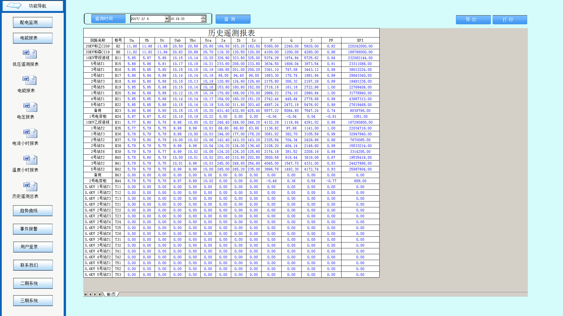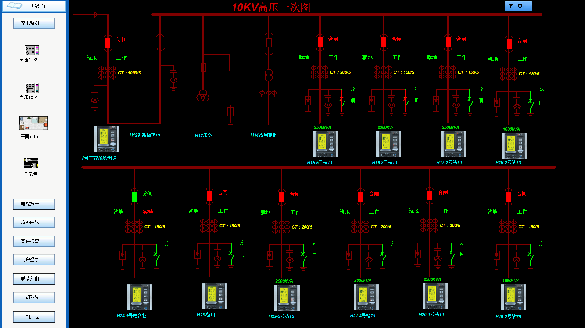 功能要求:高壓回路的一次圖界面應顯示回路名稱、三相電流、三相線電壓、總有功功率、總無功功率、總功率因數(shù)、頻率和開關量光字牌。10kV配電系統(tǒng)中所需要監(jiān)測的開關量為:斷路器分合閘信號、手車工作/試驗位置信號、遠方/就地切換位置信號、彈簧儲能位信號、接地刀信號、超高溫跳閘信號、高溫報警信號、事故信號和預告報警信號;低壓進線回路電參量界面顯示:回路名稱、開關狀態(tài)、三相電流、三相電壓、總有功功率、總無功功率、總功率因數(shù)、頻率和正向有功電能累計值。低壓出線回路界面顯示:回路名稱、開關狀態(tài)、三相(單相)電流。每個回路旁設置詳細參數(shù)按鈕,通過點擊可查看該回路詳細電參量,包括三相電流、三相電壓、總有功功率、分相有功功率、總無功功率、分相無功功率、總功率因數(shù)、分相功率因數(shù)、頻率、正向有功電能、反向有功電能、感性無功電能、容性無功電能。