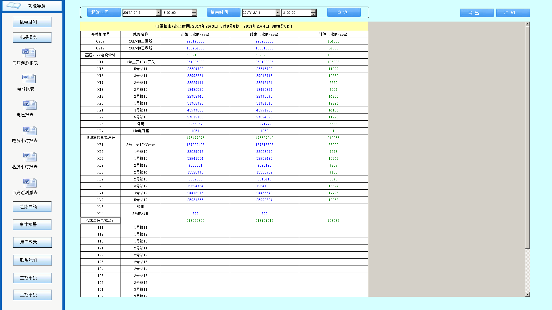 系統(tǒng)以豐富的數(shù)據(jù)報表體現(xiàn)計量體系的完整性。系統(tǒng)具備各回路定時抄表匯總統(tǒng)計功能,用戶可以自由查詢自系統(tǒng)正常運行以來任意時間段內(nèi)各配電節(jié)點的用電情況,即該節(jié)點進線用電量與各分支回路消耗電量的統(tǒng)計分析報表。該功能使得用電可視透明,并在用電誤差偏大時可追溯,維護計量體系的正確性。