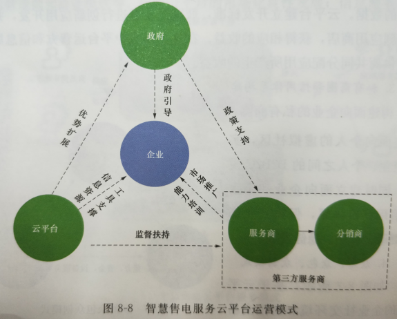 如圖8-8所示,智慧售電服務(wù)云平臺(tái)運(yùn)營(yíng)包括云平臺(tái)、政府、第三方服務(wù)商、企業(yè)四個(gè)主體。其中,