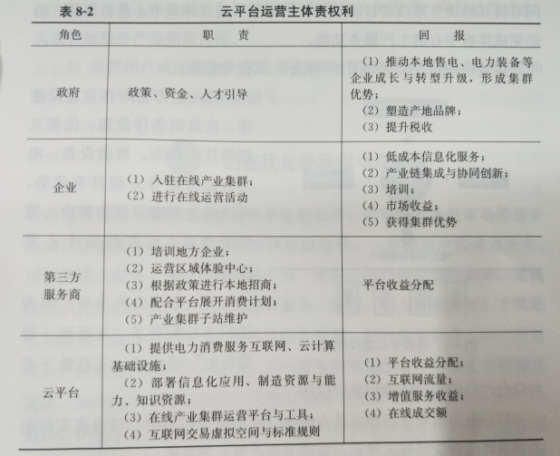 如圖8-8所示,智慧售電服務(wù)云平臺(tái)運(yùn)營(yíng)包括云平臺(tái)、政府、第三方服務(wù)商、企業(yè)四個(gè)主體。其中,云平臺(tái)組織信息服務(wù)商提供企業(yè)信息化和互聯(lián)網(wǎng)化運(yùn)營(yíng)所需的各種基礎(chǔ)設(shè)施、軟件資源、協(xié)同平臺(tái)、電子商務(wù)平臺(tái)、虛擬交易空間等,支撐企業(yè)基于互聯(lián)網(wǎng)的運(yùn)營(yíng)模式重構(gòu);第三方服務(wù)商利用云平臺(tái)所提供的資源和服務(wù)模式,組織和培訓(xùn)售電公司、電力裝備企業(yè)等入駐并應(yīng)用云平臺(tái)所提供的服 務(wù),并指導(dǎo)企業(yè)利用互聯(lián)網(wǎng)轉(zhuǎn)變經(jīng)營(yíng)模式,實(shí)現(xiàn)升級(jí)轉(zhuǎn)型;企業(yè)是云平臺(tái)服務(wù)對(duì)象的主體,獲取云平臺(tái)提供各種服務(wù),參與在線產(chǎn)業(yè)集聚,獲得價(jià)值提升。云平臺(tái)運(yùn)營(yíng)主體責(zé)權(quán)利見表8-2。