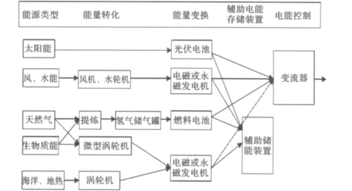 以分布式發(fā)電系統(tǒng)為例,如圖1所示,發(fā)電部分、功率調(diào)節(jié)部分有多個逆變器,其中功率轉(zhuǎn)換和控制裝置又包含諸多核心設(shè)備,如各種大功率高性能變流器、大功率風力發(fā)電機的勵磁與控制器、風力發(fā)電用永磁發(fā)電機變速調(diào)速裝置、大功率并網(wǎng)逆變器、儲能裝置以及電網(wǎng)的連接設(shè)備,燃料電池、電能輸出波形質(zhì)量設(shè)備,電壓跌落隔離和保護設(shè)備等。對于大功率燃料電池系統(tǒng)則涉及新的電路拓撲、智能集成功率變流器和智能系統(tǒng)級控制設(shè)備。