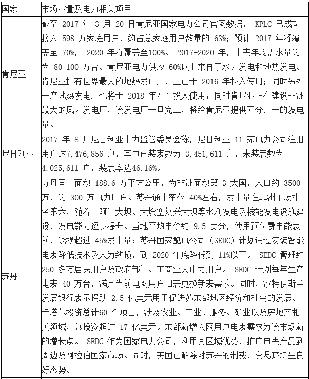 非洲各國家智能電表市場容量及電力相關項目如下: