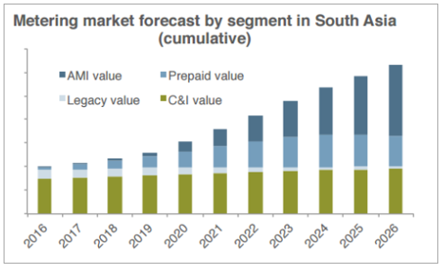 如上圖所示,伴隨東南亞各國智能電網(wǎng)整體規(guī)劃的布局和開展,整個東南亞地區(qū)智能電表的需求將穩(wěn)定增長,預計 2020 年該地區(qū)智能電網(wǎng)收入達 45 億美元,對智能電表的需求量將達到 670 萬臺左右。從南亞四國(巴基斯坦、斯里蘭卡、孟加拉國和尼泊爾)的電力供求來看,這些國家智能電網(wǎng)基礎較為薄弱,人均用電較低,隨著多邊及雙邊貸款組織的援助,未來 10 年南亞四國將在智能電網(wǎng)基礎設施上作出重大投資,從而實現(xiàn)電網(wǎng)現(xiàn)代化,預計 2016-2026 年南亞智能電網(wǎng)投資總計達 81 億美元。