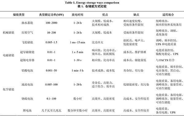 各種儲(chǔ)能方式特點(diǎn)及其優(yōu)缺點(diǎn)比較如表1所示。