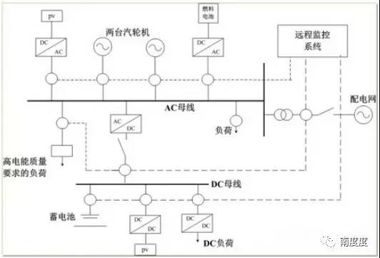 日本是亞洲研究和建設(shè)微電網(wǎng)較早的國(guó)家,自2003年開(kāi)始,日本新能源與工業(yè)技術(shù)發(fā)展組織(NewEnergyandIndustrialTechnologyDevelopmentOrganization,NEDO)就協(xié)調(diào)高校、科研機(jī)構(gòu)和企業(yè)先后在八戶市、愛(ài)知縣、京都市和仙臺(tái)市等多地區(qū)建設(shè)了微電網(wǎng)示范工程,研究、驗(yàn)證了一批微電網(wǎng)關(guān)鍵技術(shù),其發(fā)展目標(biāo)主要定位于能源供給多樣化、減少污染、滿足用戶的個(gè)性化電力需求。日本采用的微電網(wǎng)結(jié)構(gòu)如圖所示