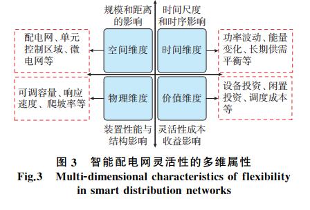 智能配電網(wǎng)靈活性不僅需要全面反映各種不同層面、不同類型、不同特性靈活性資源的控制能力與響應特性,同時需要服務于配電網(wǎng)在不同場景下的調度與優(yōu)化需求,其多維屬性特征集中體現(xiàn)在時間、空間、物理和價值4個方面,如圖3所示.