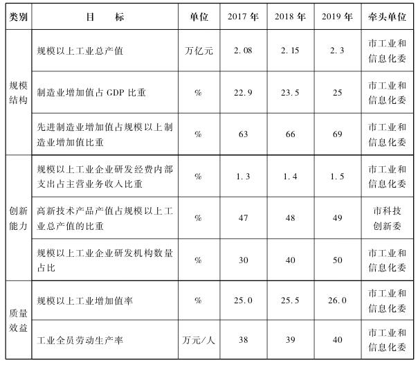 到2019年底,制造強市建設(shè)取得重要進展,新一代信息技術(shù)對制造業(yè)發(fā)展的支撐能力大幅提升。建立起較為完善的制造業(yè)創(chuàng)新體系,掌握一批關(guān)鍵核心技術(shù),技術(shù)創(chuàng)新處于國內(nèi)領(lǐng)先,質(zhì)量效益明顯提高。培育一批國際知名、國內(nèi)領(lǐng)先的行業(yè)優(yōu)勢骨干企業(yè),重點領(lǐng)域的產(chǎn)業(yè)國際化布局取得積極成效。重點行業(yè)的單位工業(yè)增加值能耗、物耗、污染物排放達到國內(nèi)領(lǐng)先水平。