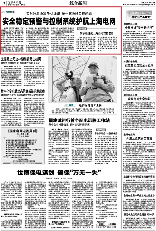 4月29日,由國(guó)網(wǎng)電力科學(xué)研究院研發(fā)的上海電網(wǎng)安全穩(wěn)定預(yù)警與控制系統(tǒng)(第一階段 世博配套工程)項(xiàng)目在上海電網(wǎng)投入試運(yùn)行。世博會(huì)期間,該系統(tǒng)將主動(dòng)提升上海主網(wǎng)應(yīng)對(duì)交直流混合故障等嚴(yán)重事故的能力,確
