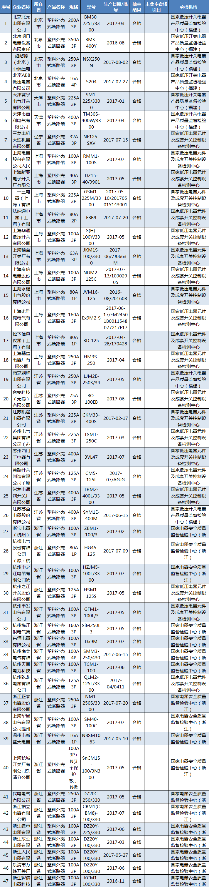 塑料外殼式斷路器產(chǎn)品質(zhì)量國家監(jiān)督抽查產(chǎn)品及其企業(yè)名單