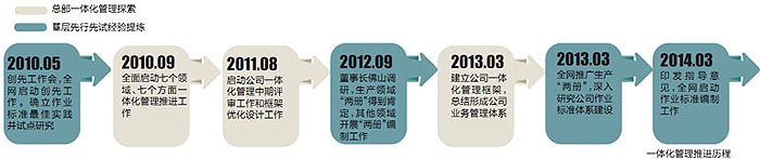 2010年9月,公司全面啟動七個領(lǐng)域、七個方面一體化管理推進工作,3年多時間來,陸續(xù)進行了一體化管理中期評審和框架優(yōu)化設(shè)計、推廣生產(chǎn)“兩冊”、深入研究公司作業(yè)標準體系建設(shè)、構(gòu)建公司一體化管理框架,總結(jié)形成公司業(yè)務(wù)管理體系等工作。