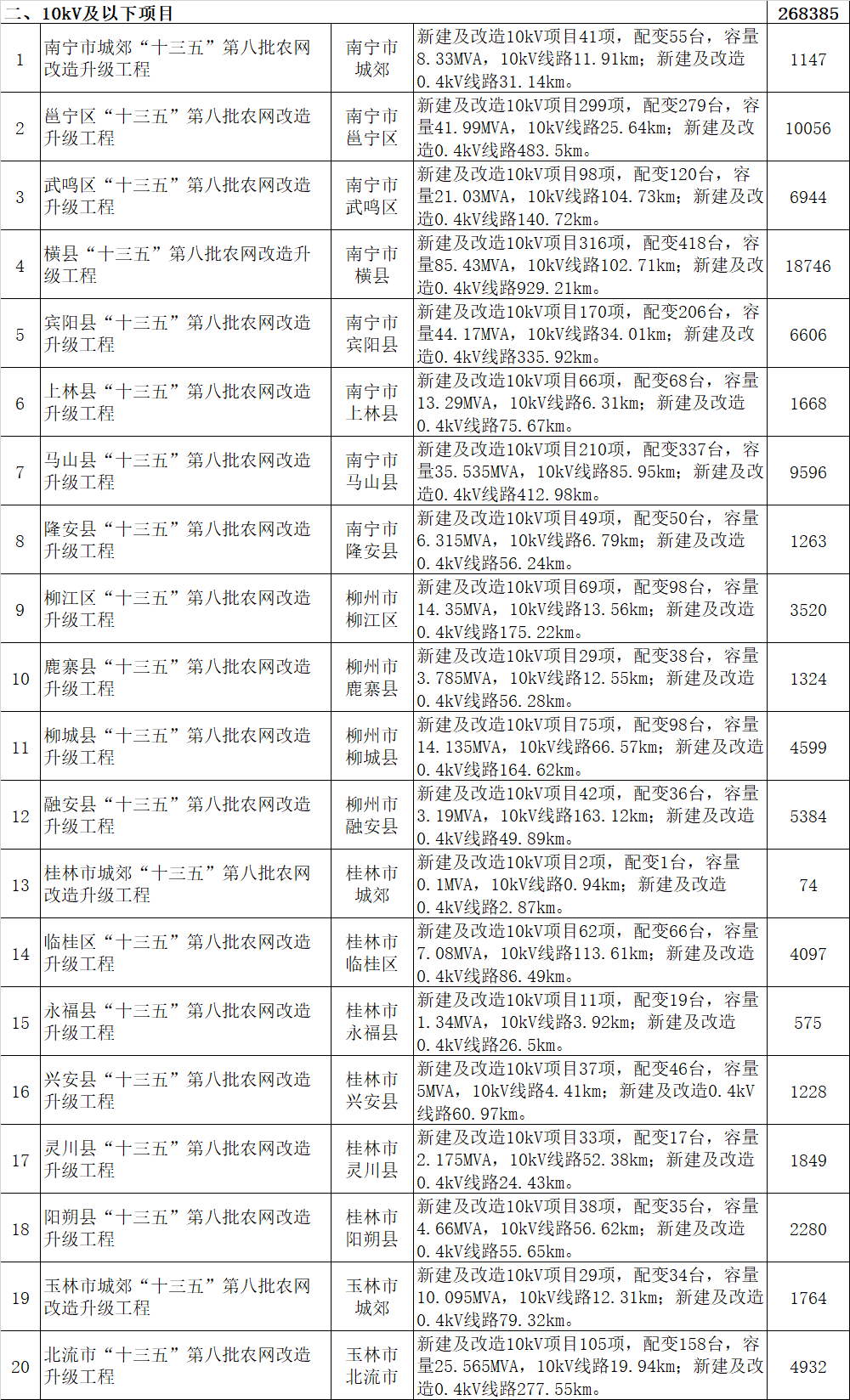 二、廣西電網(wǎng)有限責任公司“十三五”農(nóng)網(wǎng)改造升級工程項目(第八批)總投資估算為276795萬元,建設(shè)規(guī)模為:項目細項共5092項,其中35kV項目15項,新增及改造35千伏變電站8座,主變11臺,容量66兆伏安,35kV線路62.86公里,投資估算8410萬元;10kV項目5077項,新建及改造配變6002臺,容量854.146兆伏安,10kV線路4804公里,新建及改造0.4kV線路8848公里,投資估算268385萬元。項目共64個,涉及43個縣級供電企業(yè)和6個直供區(qū)。