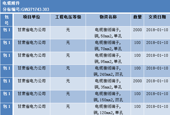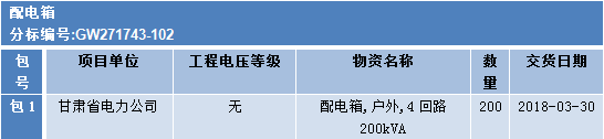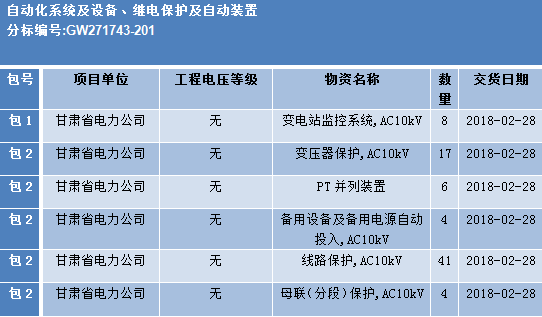 國網(wǎng)甘肅2017年第三次配網(wǎng)(居配工程)協(xié)議庫存招標(biāo)采購招標(biāo)公告,此次招標(biāo)涉及的物資有:開關(guān)柜、配電箱、自動(dòng)化系統(tǒng)及設(shè)備、繼電保護(hù)及自動(dòng)裝置、電源系統(tǒng)、電能計(jì)量箱(金屬)、電能計(jì)量箱(非金屬)、鐵附件及其