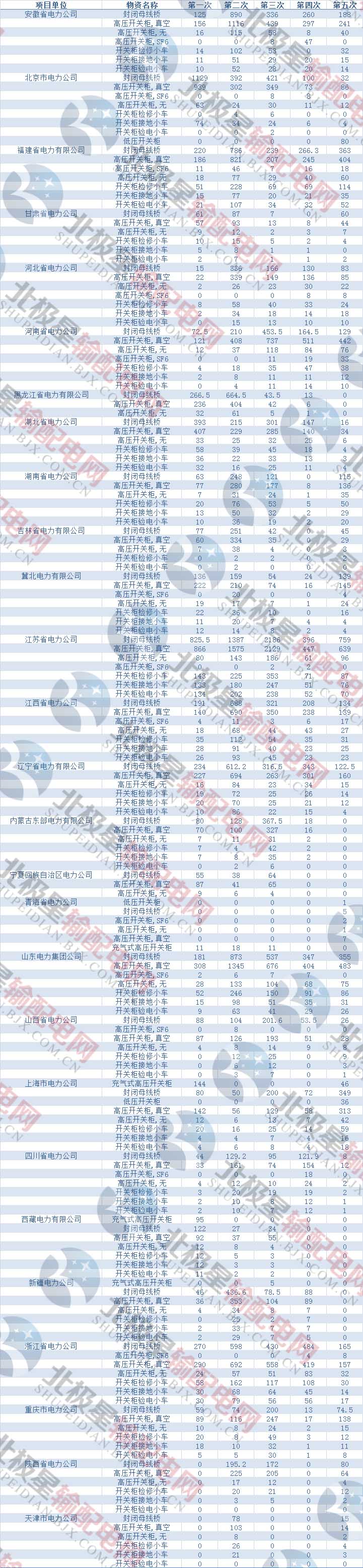 國(guó)家電網(wǎng)公司輸變電項(xiàng)目變電設(shè)備招標(biāo)1-5批次各省10KV開關(guān)柜招標(biāo)情況