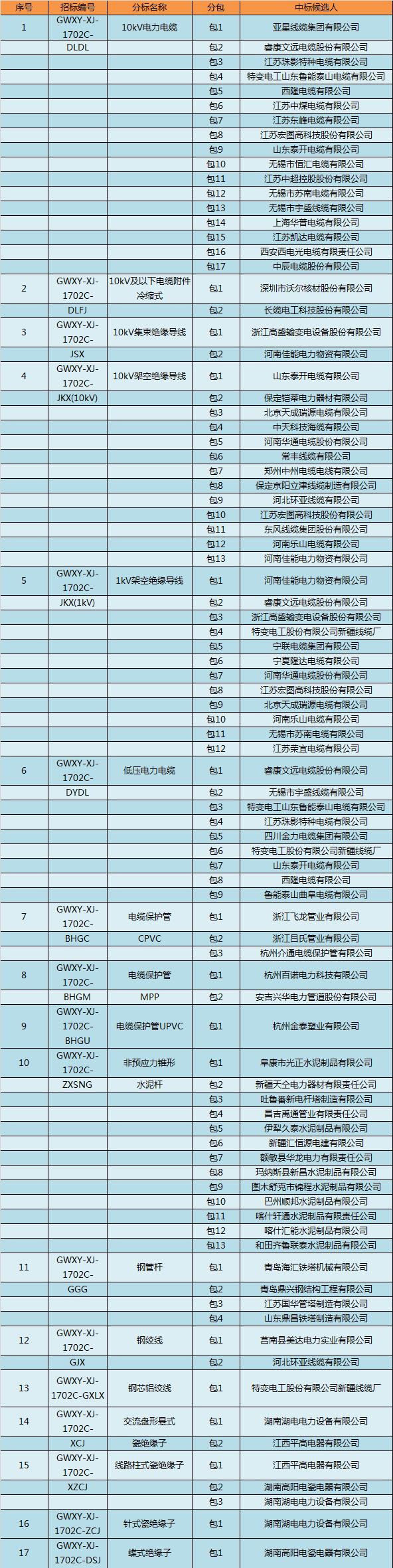 國網(wǎng)新疆2017年第二次配網(wǎng)設(shè)備/線材協(xié)議庫存貨物招標(biāo)中標(biāo)候選人