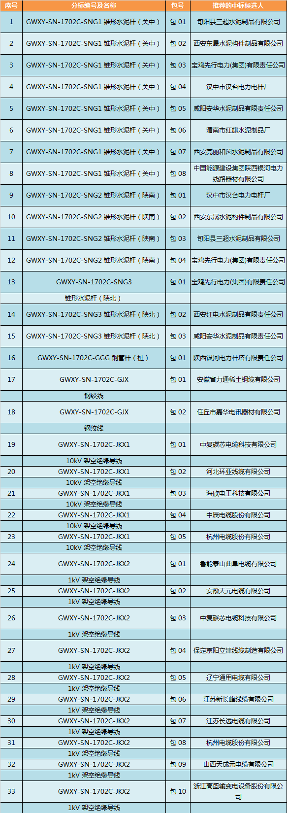 國網(wǎng)陜西省電力公司 2017 年第二次配網(wǎng)線路材料協(xié)議庫存招標(biāo)采購項(xiàng)目中標(biāo)公告