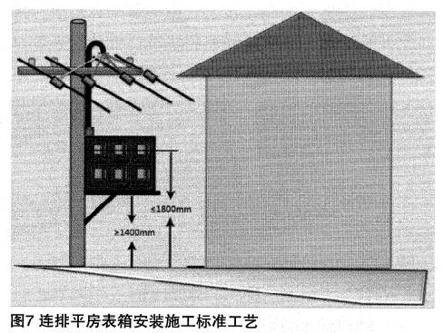 多層住宅表箱安裝工藝,連排平房表箱安裝工藝,桿上表箱安裝和變臺(tái)計(jì)量箱安裝工藝。連排平房表箱安裝施工標(biāo)準(zhǔn)工藝如圖7所示。