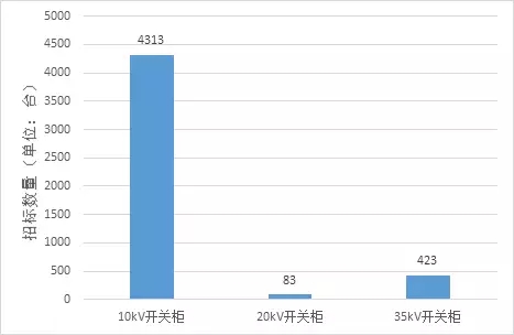 按設備類型來看,本次共招標充氣式開關柜21臺,全部為 35kV設備電壓等級。本次共招標高壓開關柜4798臺,其中,10kV設備電壓等級招標4313臺,20kV設備電壓等級招標83臺,35kV設備電壓等級招標402臺。
