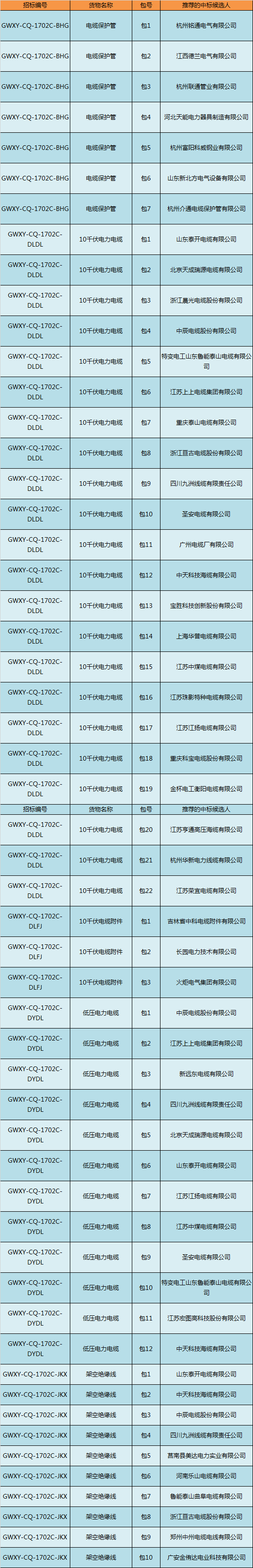國網(wǎng)重慶2017年第二次配網(wǎng)設備/線材協(xié)議庫存貨物招標中標候選人