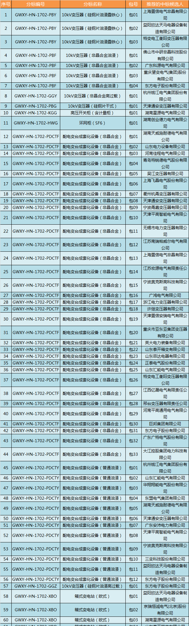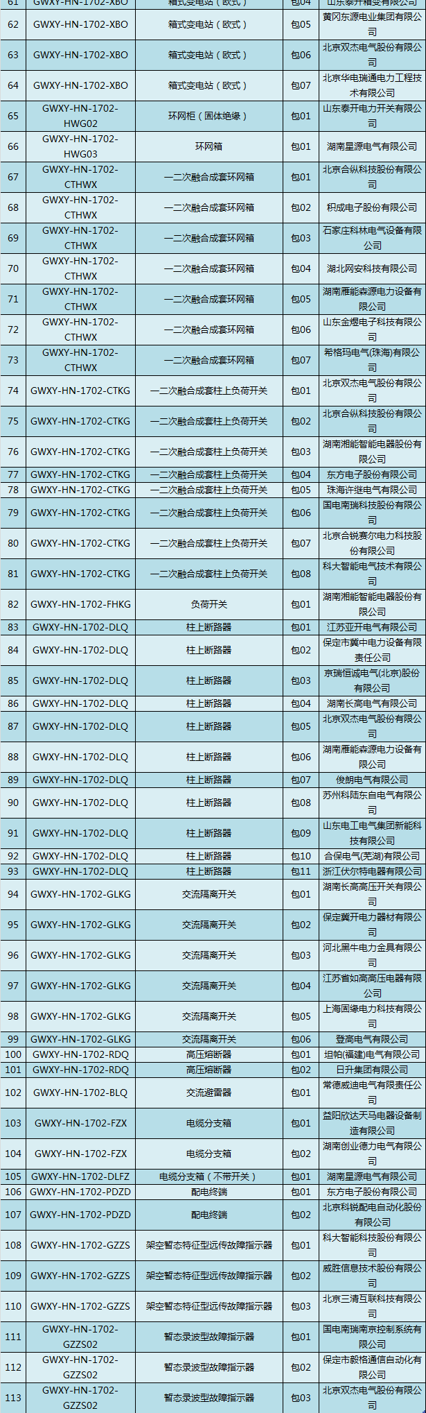 國網(wǎng)(湖南)2017年第二次配網(wǎng)設備/線材協(xié)議庫存中標結果
