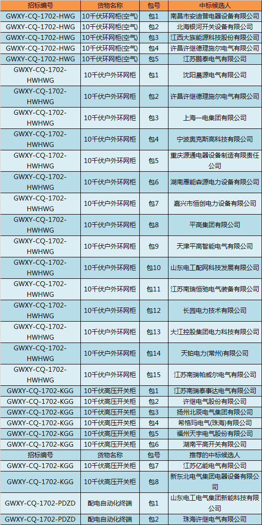 國(guó)網(wǎng)重慶市電力公司 2017 年第二次配網(wǎng)設(shè)備協(xié)議庫(kù)存貨物招標(biāo)采購(gòu)中標(biāo)結(jié)果公告(招標(biāo)編號(hào): GWXY-CQ-1702)國(guó)網(wǎng)重慶市電力公司 2017 年第二次配網(wǎng)線路材料協(xié)議庫(kù)存貨物招標(biāo)采購(gòu)中標(biāo)結(jié)果公告(招標(biāo)編號(hào): GWXY-CQ-1702C)