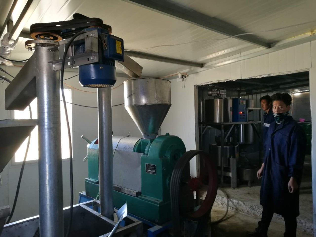 剛進(jìn)小院兒的門,一股濃濃的菜籽油香味兒撲面而來(lái)。在外表藍(lán)白相間的工作間里,四五名村民正在緊張而有序地進(jìn)行著各項(xiàng)工作,有的在往機(jī)器里增加油菜籽,有的在拿著鏟子翻炒,有的在接榨好的菜籽油,而最歡快的要數(shù)馬力十足、渾身力氣出不完的電動(dòng)榨油機(jī)了,這也是濃濃的香味的源頭。