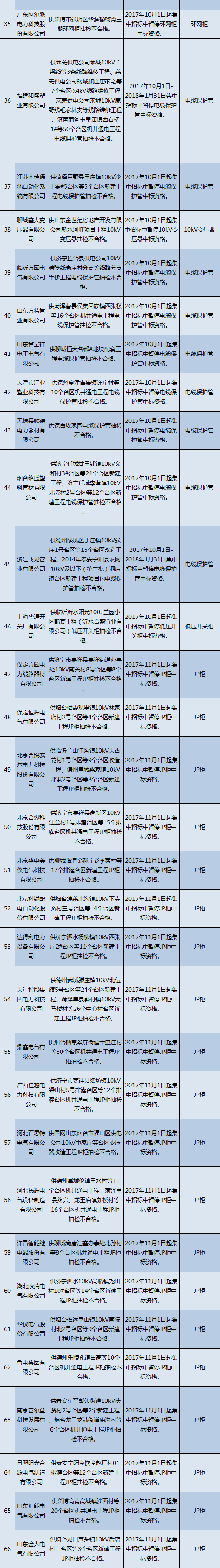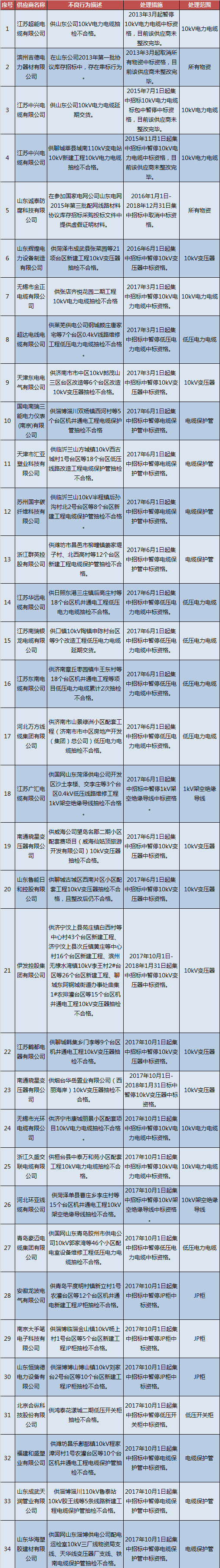 為促進供應(yīng)商誠信履約,保證產(chǎn)品質(zhì)量,確保電網(wǎng)建設(shè)順利進行及安全可靠供電,依據(jù)《國家電網(wǎng)公司供應(yīng)商不良行為處理管理細則》的有關(guān)規(guī)定,對出現(xiàn)產(chǎn)品質(zhì)量問題、履約不誠信等問題的供應(yīng)商進行了處理。具體處理情況如下: