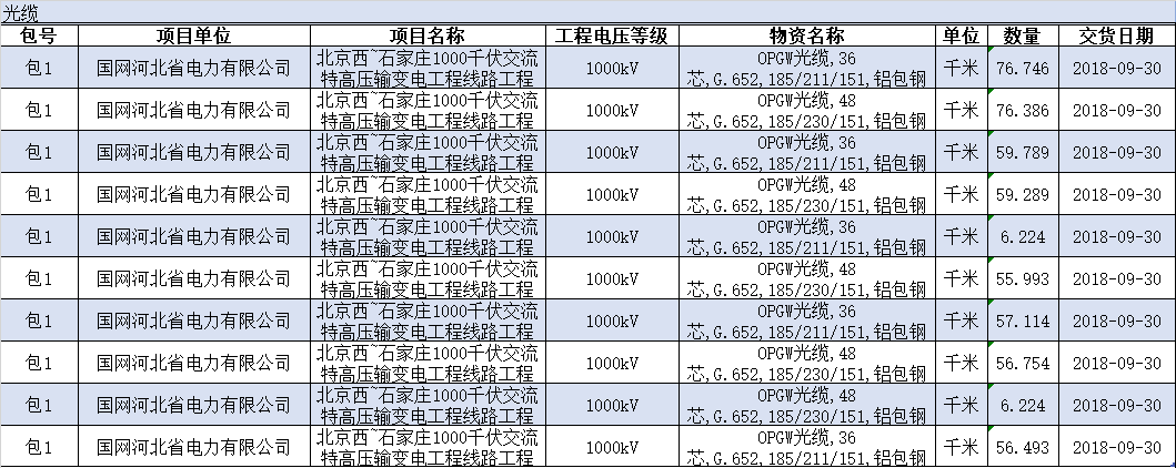 國家電網(wǎng)有限公司2018年北京西~石家莊1000千伏交流特高壓工程導(dǎo)線集中招標(biāo)活動公布,其中涉及光纜、線路金具、絕緣子、導(dǎo)線四類物資,具體內(nèi)容如下: