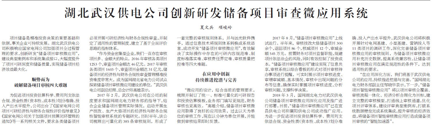 2018年3月,國網(wǎng)湖北電力對武漢供電公司儲備項目審核微應(yīng)用深化應(yīng)用及推廣進行部署。目前,“儲備項目審核微應(yīng)用”已在宜昌供電公司和襄陽供電公司成功推廣應(yīng)用。為進一步促進項目投資估算科學(xué)、費用列支依法合規(guī)、資金性質(zhì)(資本性、成本性)劃分準(zhǔn)確、投入產(chǎn)出水平提升,武漢供電公司將積極開展針對電網(wǎng)基建、小型基建、營銷投入等11類項目的調(diào)研工作,深化完善儲備項目審核微應(yīng)用的審核規(guī)則,為儲備項目審核微應(yīng)用補充歷史數(shù)據(jù),提高系統(tǒng)兼容性,讓儲備項目審核微應(yīng)用在滿足規(guī)范性的條件下,達到通用性的要求。