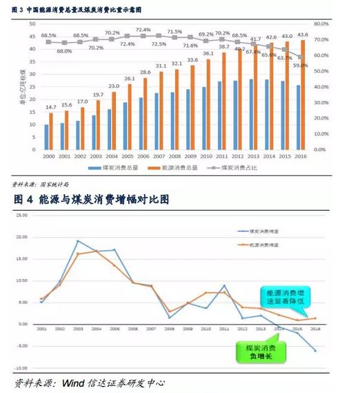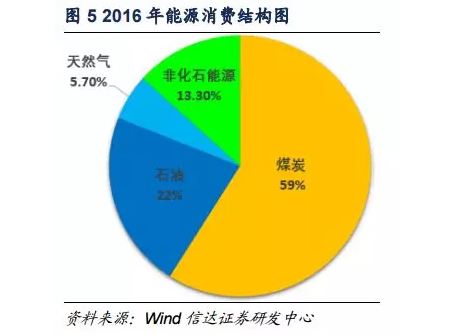 中國多煤、缺油、少氣的能源資源自然稟賦特點決定了目前的以煤炭為主的能源消費結(jié)構(gòu),近年來,中國現(xiàn)有能源結(jié)構(gòu)不斷變化,傳統(tǒng)能源尤其是煤炭資源消費量逐漸降低,能源結(jié)構(gòu)調(diào)整的步伐十分強勁。2015年,中國能源消費總量約為42.5億噸標煤,其中,煤炭消費占比64%,石油消費占比18%,天然氣消費占比6%,化石能源消費比重占能源消費總量的88%,非化石能源消費占比約為12%;在煤炭去產(chǎn)能政策的強壓下,2016年,中國能源消費總量約為43.6億噸標準煤,其中煤炭消費占比59%,化石能源消費占比86.7%,非化石能源消費比重達到13.3%。新常態(tài)下,能源消費增速顯著降低,2018年隨著產(chǎn)能出清的到來,步入能源新周期后的煤炭消費占比將會更低,能源消費增速仍將繼續(xù)降低,我們預(yù)計“十三五”中國能源消費增速將在1%~2%之間浮動。