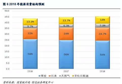 綜合考慮我國經(jīng)濟發(fā)展、環(huán)境約束、能源政策取向、能源效率進步前景以及能源需求約束,2018年,煤炭在整個能源消費中的占比將持續(xù)小幅下降,但國內(nèi)能源消費總量將適度提升,由于非化石能源的成本劣勢在18年不會有顯著改善,這一系列的影響必然會使2018年的石油以及天然氣需求上漲,我們預(yù)測:2018年能源消費總量約為45.5億噸標煤,       其中,煤炭消費總量約為33億噸,石油消費約為7.8億噸,天然氣消費約為2700億立方米,非化石能源消費約為6.4億噸標煤。在一帶一路的促進下,中亞地區(qū)油氣管道逐步擴建,中亞中俄管道氣以及東南沿海LNG是未來天然氣進口的主要來源,天然氣進口量約為1000億立方米,進口量持續(xù)上升,天然氣消費占比也將穩(wěn)步提高;原油進口量至少為3.5億噸,原油進口量將持續(xù)上升,原油消費占比也將小幅上升。增油、提氣、強儲備將既是未來能源發(fā)展的必然趨勢,又是全面實現(xiàn)能源結(jié)構(gòu)轉(zhuǎn)型的必然途徑。
