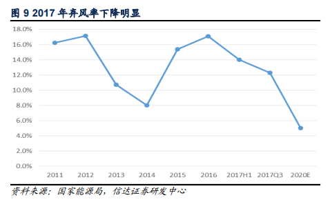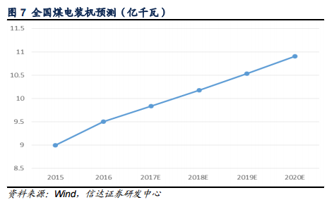 2016年底,全國煤電裝機9.5億千瓦??紤]到國家能源局的緩建政策,我們預(yù)計2017-2020年煤電裝機增速將保持低位,年均復(fù)合增速約在3.5%,每年約新增裝機0.33~0.37億千瓦,達到2020年煤電裝機控制在11億千瓦以內(nèi)的要求。