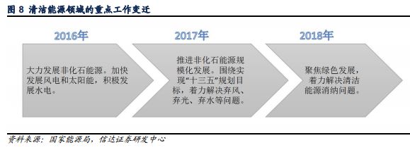 2018年能源工作會議提出,要聚焦綠色發(fā)展,著力解決清潔能源消納問題,著力推進能源結(jié)構(gòu)調(diào)整戰(zhàn)略工程,統(tǒng)籌推進煤炭清潔高效利用,大力推進能源清潔發(fā)展水平。歷年的全國能源工作會議顯示,清潔能源發(fā)展的重點工作,已經(jīng)從過去的大規(guī)模加速發(fā)展,轉(zhuǎn)變?yōu)榻鉀Q消納的問題上來了。